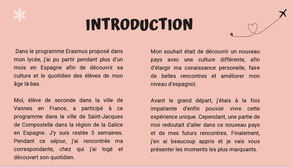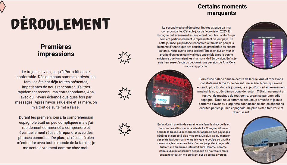 Cela fait maintenant un an que j'ai rencontré Cécilia, ma correspondante espagnole de La Corogne. Elle est d’abord venue passer dix jours chez moi, découvrant ma vie de lycéenne française. Puis, du 10 au 19 octobre 2023, j'ai eu l'occasion de vivre cette expérience à La Corogne, grâce à un échange organisé par notre lycée.