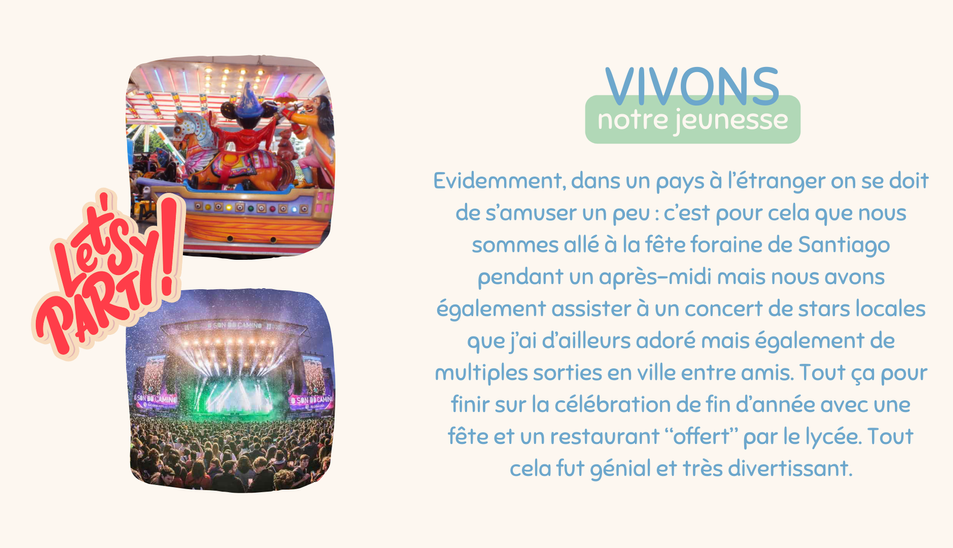 Je découvre que les Espagnols font souvent la fête : des sortes de fêtes foraines avec un concert... cela attire pleins de gens. Heureusement, cela me donne l’occasion de voir mes amis français qui eux aussi vont à ses fêtes avec leurs correspondants.
